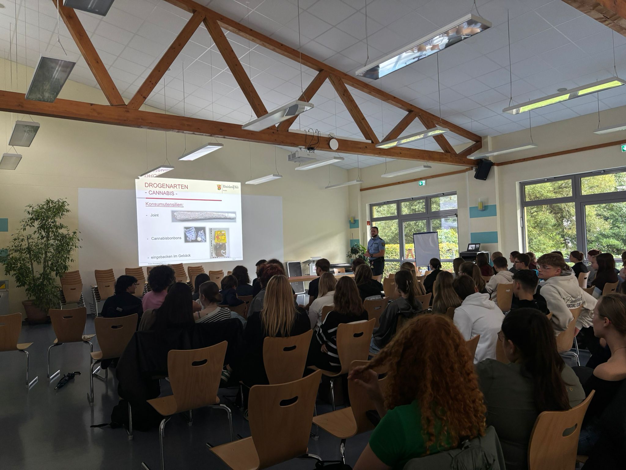 Den Auftakt machte Polizeioberkommissar Christopher Swisshelm von der Polizeiinspektion Kusel. Anhand eines Unfallbeispiels verdeutlichte er die Folgen von Alkohol und Drogen im Straßenverkehr. Er sprach über Promillegrenzen, THC-Nachweise und die rechtlichen Konsequenzen, die den Verlust der Fahrerlaubnis, Geldbußen sowie Geld- und Freiheitsstrafen umfassen können. Besonders eindrücklich wurde, dass auch schon geringe Mengen gravierende Auswirkungen haben. Ein Atem-Alkoholtest mit Schüler Lukas Morgenstern zeigte immerhin ein beruhigendes Ergebnis von 0,0 Promille.