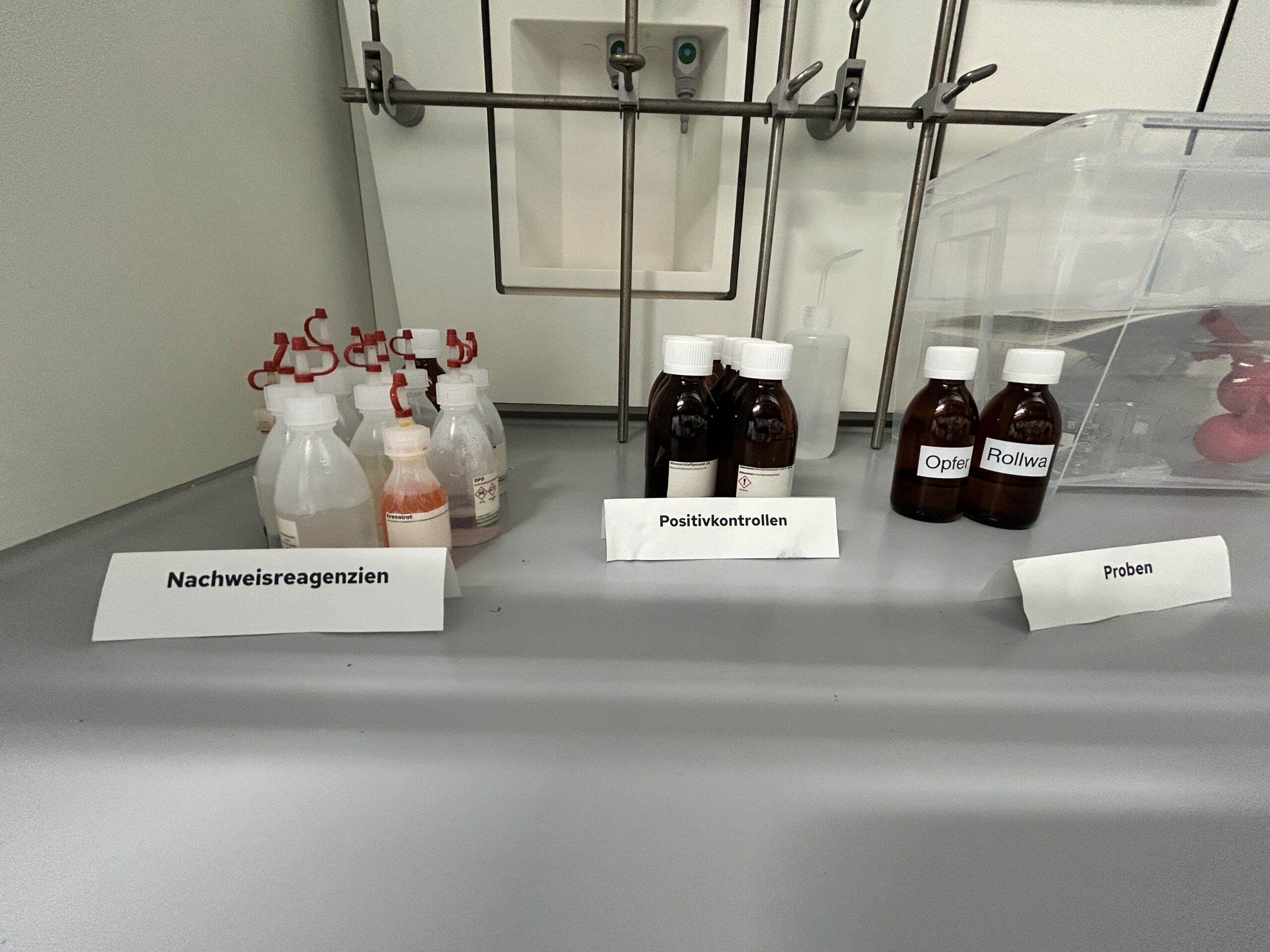 Dort haben wir eine kurze Sicherheitseinweisung erhalten und haben dann mithilfe einer interaktiven Powerpoint-Präsentation bei einem Quiz um Punkte gekämpft. Gleich darauf folgten Experimente zum Abgleichen des Poolwassers mit dem Wasser in der Lunge des Opfers. Dabei haben wir verschiedene Nachweisreaktionen kennengelernt.