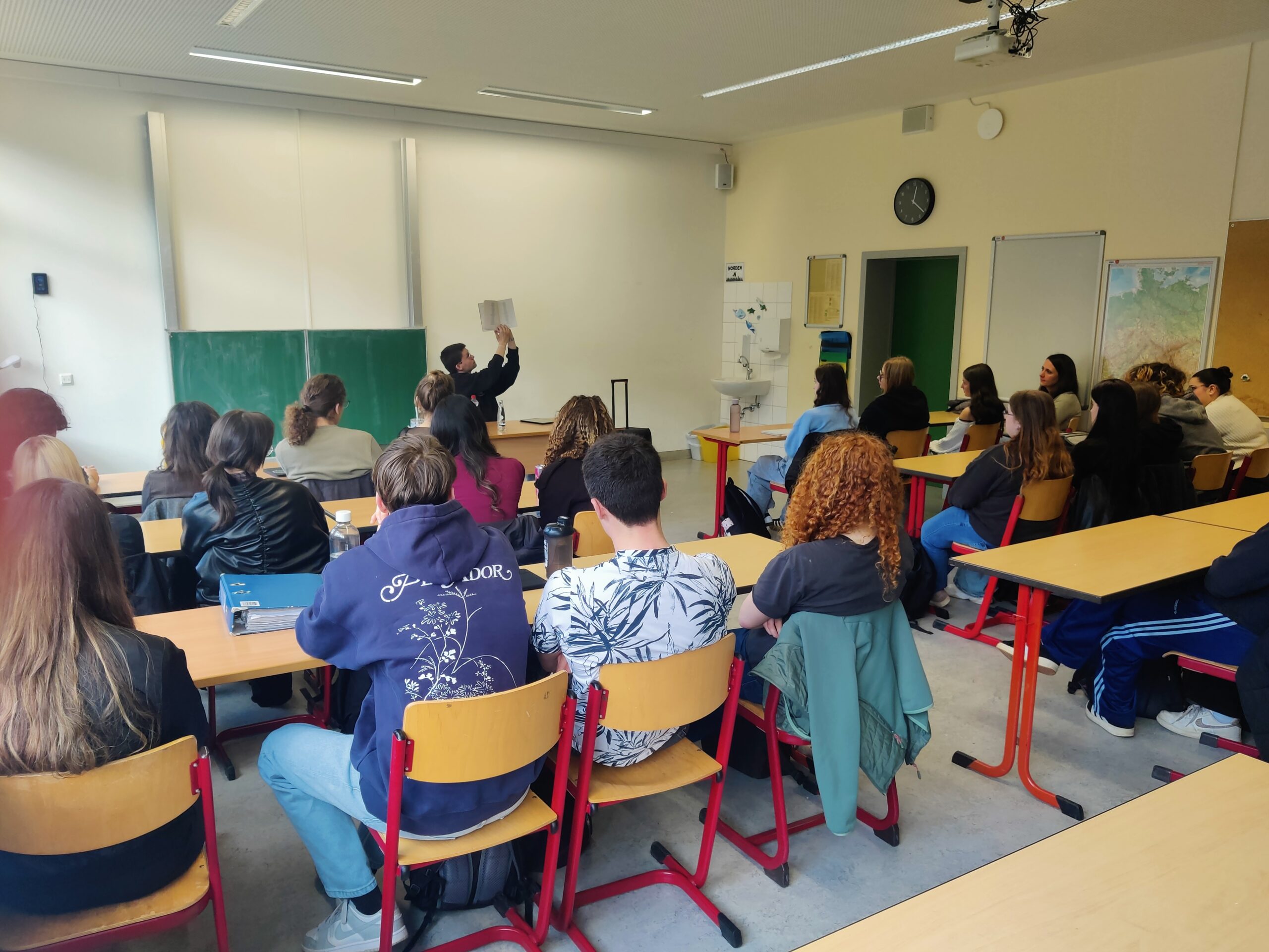Kurz vor Beginn der Osterferien durften wir uns über einen kurzfristigen Besuch des Buchautors und Aktivisten Jakob Springfeld freuen. Jakob berichtete über seine Jugend im Zwickau der 90er und 2000er Jahre und seine direkten Erfahrungen mit Rechtsextremismus. Vor den Leistungskursen der 12. Jahrgangsstufe von Frau Graf und Herrn Neuberger sprach Jakob über teils gefährliche und prägende Ereignisse dieser Zeit, welche er in seinem Buch „Unter Nazis. Jung, ostdeutsch und gegen Rechts.“ festgehalten hat. Die SchülerInnen bekamen einen direkten Einblick in den aktivistischen Kampf Jakobs und wie er auch im Umfeld des Terrors des NSU aufgewachsen war. Anschließend wurde in einer Fragerunde noch über viele Facetten der aktuellen politischen und gesellschaftlichen Entwicklungen gesprochen. Ein inspirierender Einblick in Strukturen, welcher zum Eintreten für positive Werte und gegen Rechtsextremismus motivierte.