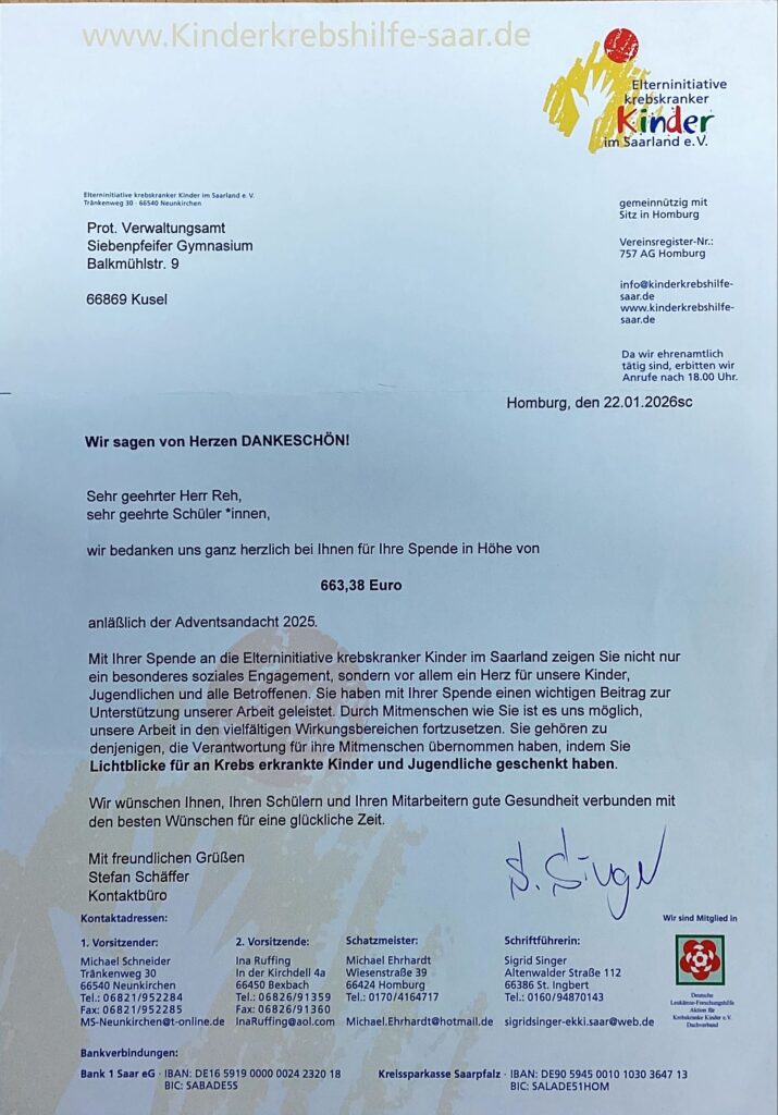 Die Elterninitiative krebskranker Kinder im Saarland e.V. bedankt sich bei der Schulgemeinschaft für die Spende über 663 Euro. Dieser Betrag wurde als Kollekte in den diesjährigen Adventsandachten eingesammelt.