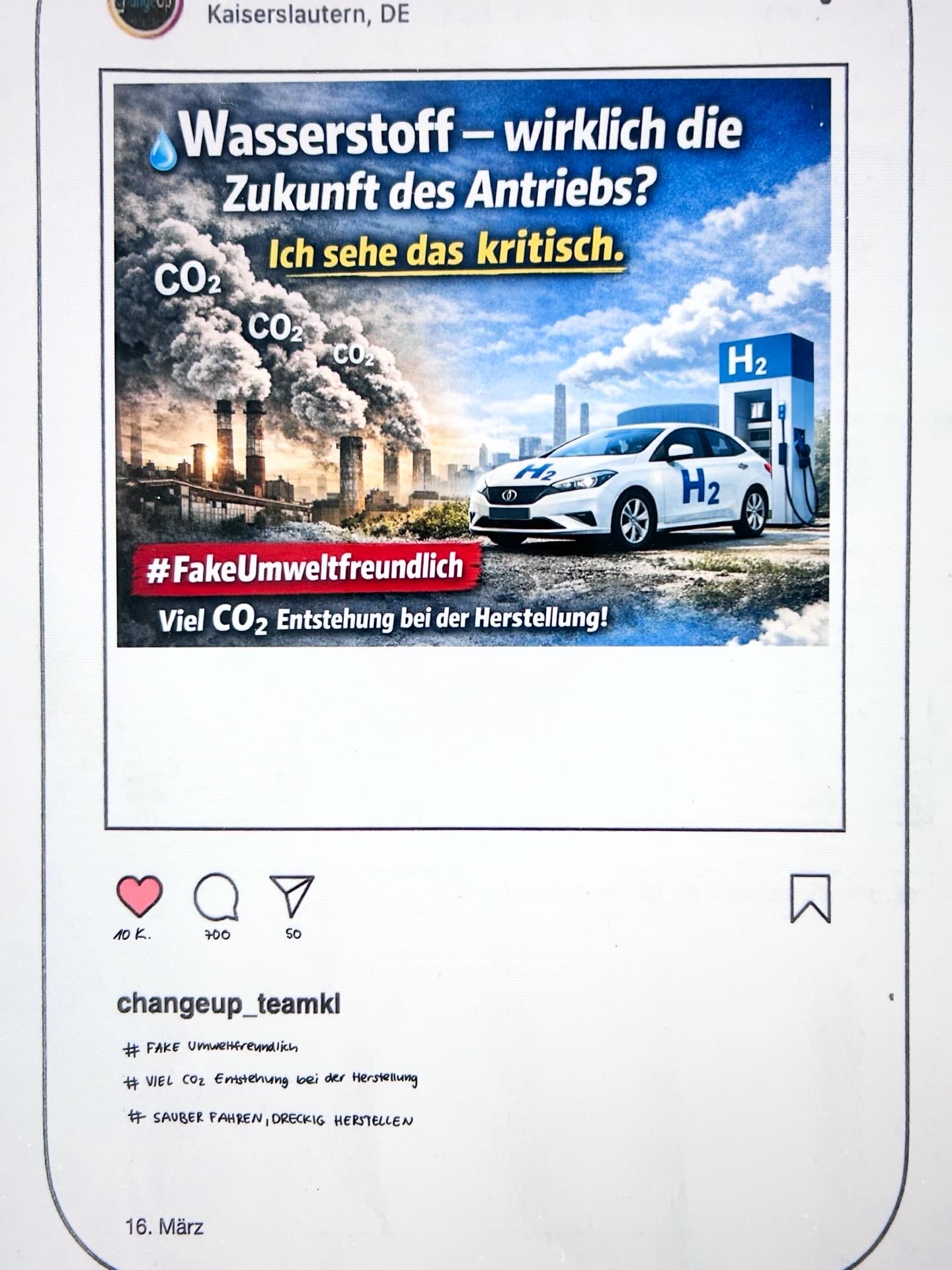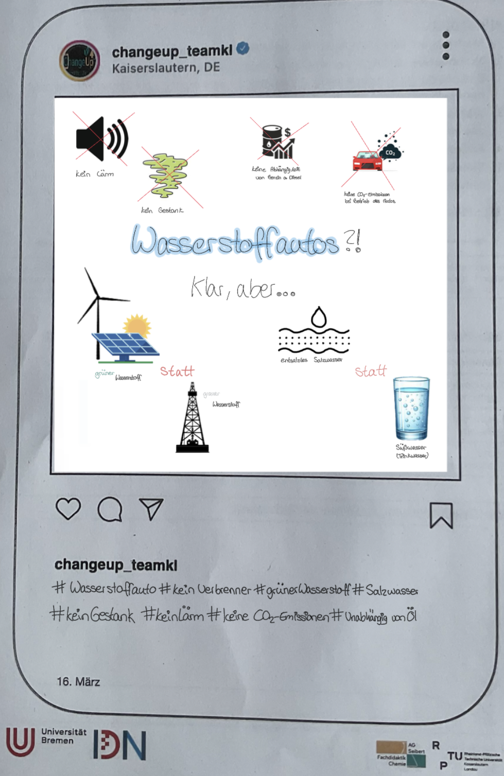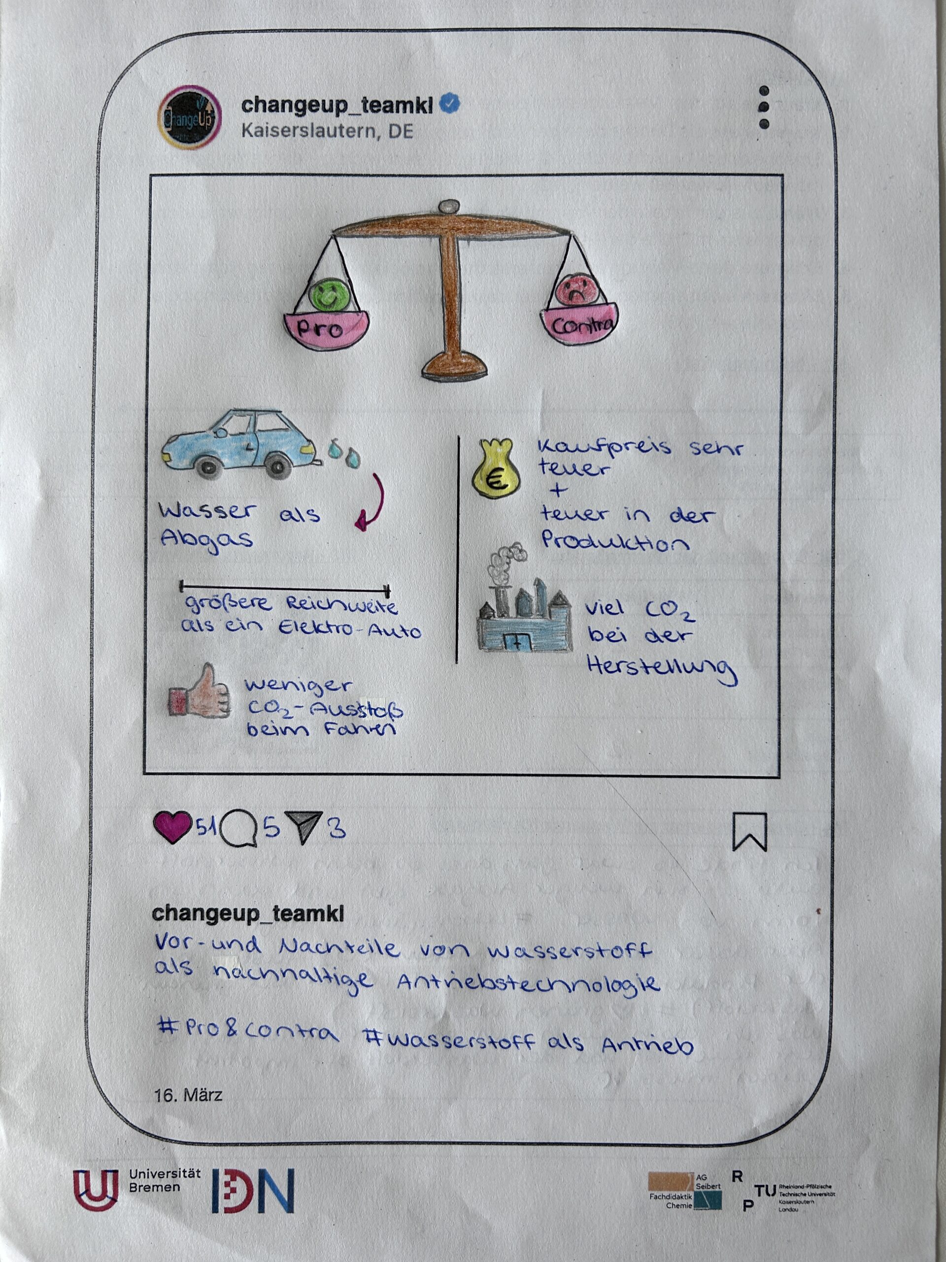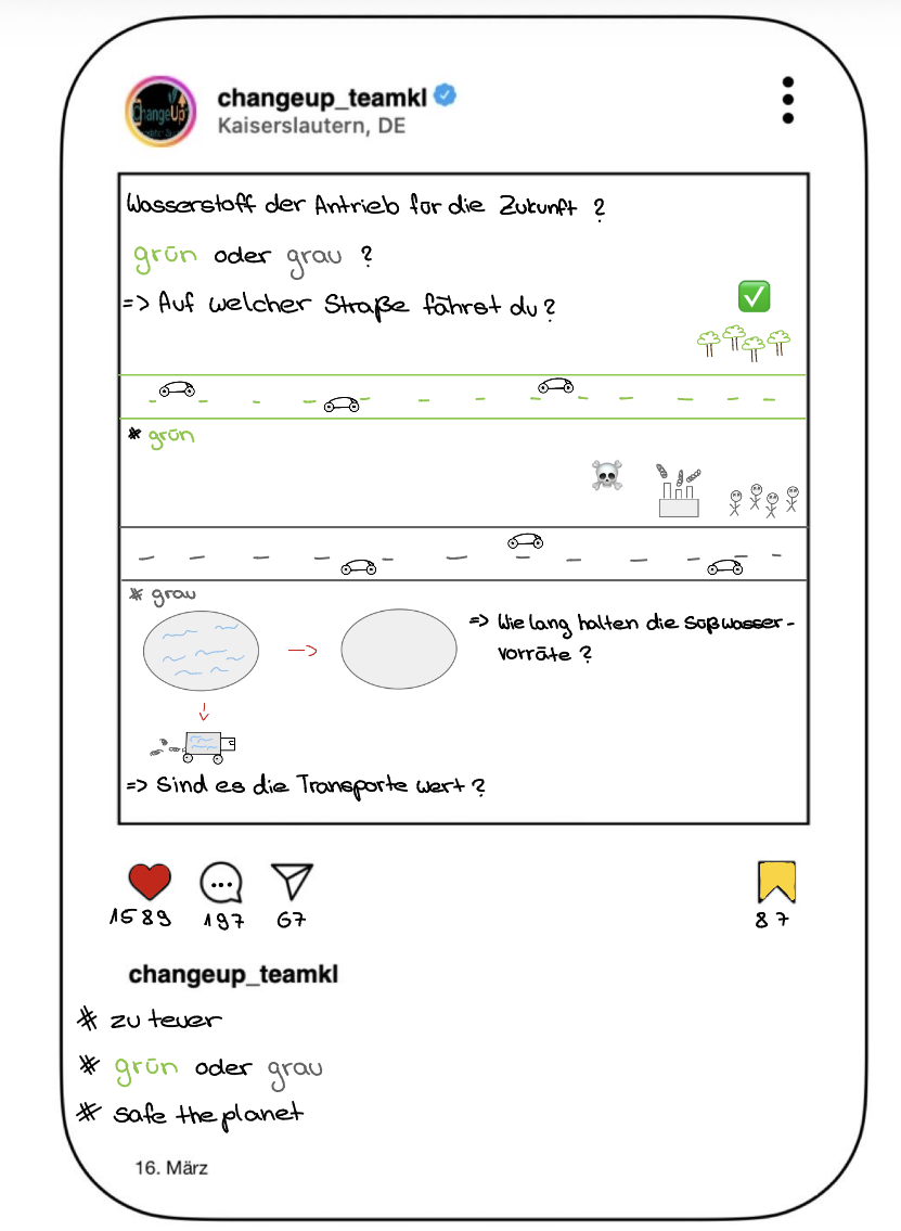 In Kooperation mit der RPTU Kaiserlautern und unter der Leitung von Isabel Seibert haben die Klassen 10c und 10d die Nachhaltigkeit von Wasserstoff als Antriebstechnologie der Zukunft unter verschiedenen Aspekten beleuchtet. Die Schülerinnen und Schüler haben in dieser Einheit Fachwissen mit gesellschaftlichen Perspektiven und medialer Ausgestaltung in Form eines Instagram-Beitrags verbunden. Anfangs wurde das nötige Fachwissen erarbeitet, um ein solches Thema kontrovers zu betrachten. Daraus resultierten unterschiedliche Beiträge, die am Ende „geliked“ wurden. Kriterien, die zu „Likes“ führen, konnten so schnell herausgestellt werden. Ein übergeordnetes Ziel war es, den Schülerinnen und Schülern so die Kompetenz zu vermitteln, Beiträge auf Social Media kritisch zu hinterfragen und sich eine eigene Meinung zu bilden.